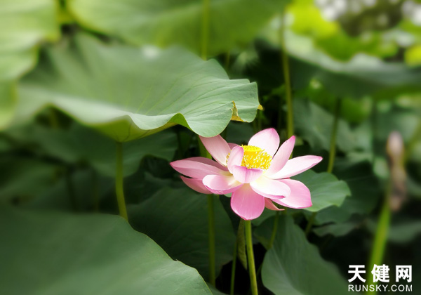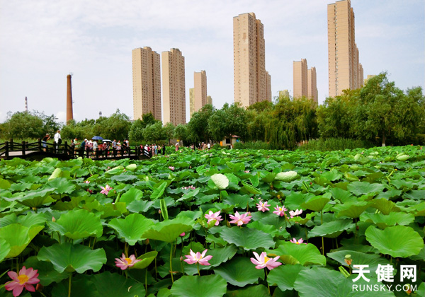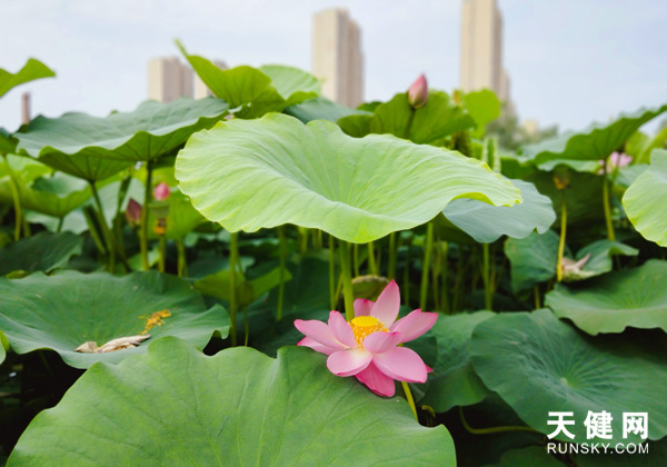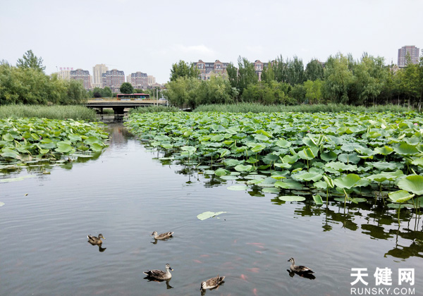 7月,正值睡莲盛花期,荷花也星星点点盛开,芦苇长势繁盛,给这片核心城区的水域带来了浓浓的郊外野意。