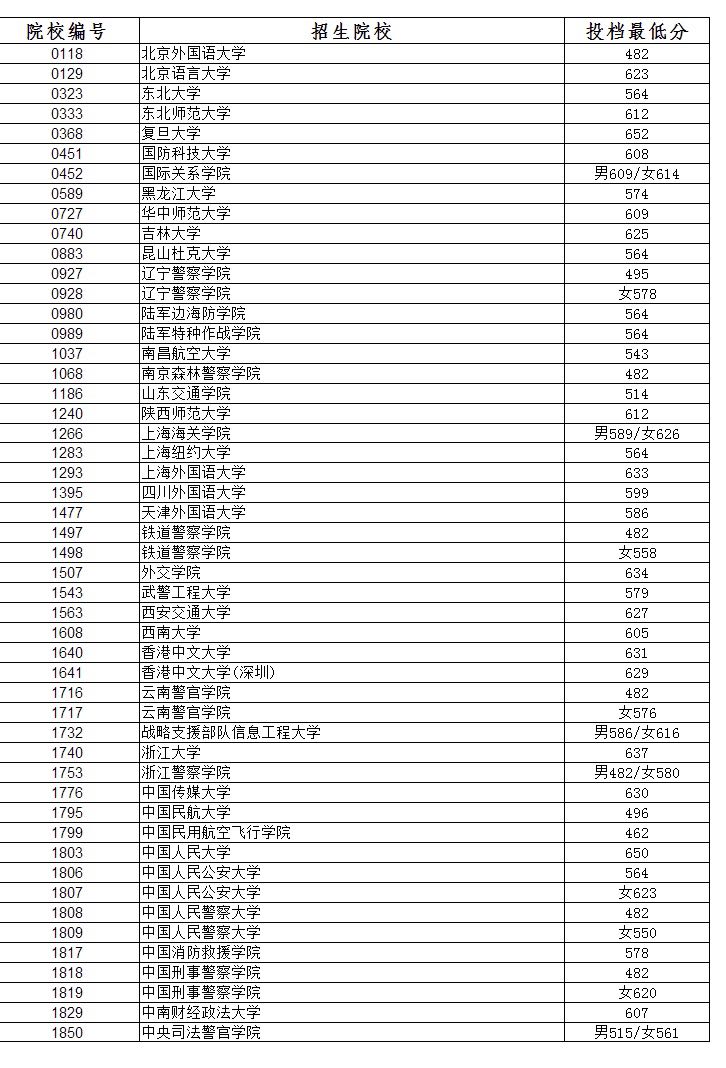 2019年辽宁省普通高等学校招生录取普通本科提前批(文史)第一次投档最低分