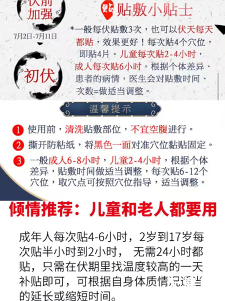 记者在电商平台也看到,很多商家都在产品详情中标明加长贴敷时间,并称头伏前10天为伏前加强期,末伏后10天为伏后加强期。