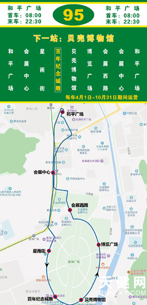 据悉,95路季节性旅游线路由和平广场始发,途经中山路、星海广场外环路、会展西路、会展路、中山路、高尔基路至和平广场,全长5.3公里。沿途设置7个站点,分别为和平广场、会展中心、星雨街、百年纪念城雕、贝壳博物馆、博览广场、会展西路。