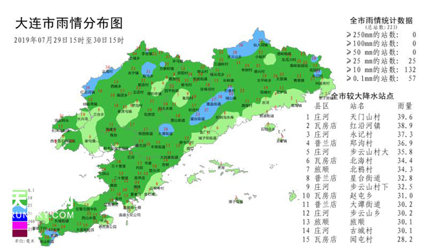 小煜给喃们分析一下,29日傍晚开始,我市陆续出现阵雨或雷阵雨,截至(30日)15时,旅顺、瓦房店、普兰店和庄河,上述地区的部分乡镇出现大雨,其他大部分地区出现中雨。全市平均降雨量为13.9毫米(中雨),有25个观测站出现大雨,有132个观测站出现中雨。最大降雨量出现在庄河天门山为39.6毫米,一小时最大雨量出现在瓦房店红沿河镇为29毫米,比前期预测的全市性大雨、局部暴雨的降雨量减少10多毫米。