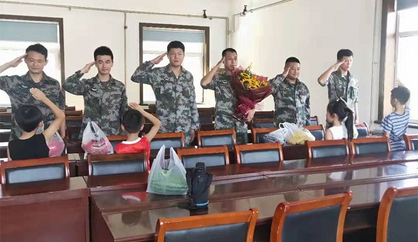 天健网消息(林春 记者 韩晓菲)军爱民,民拥军,军民鱼水一家亲。炎热的天气也没能阻挡住小学生拥军的脚步,8月1日,沙河口区东北路小学一年级的小同学在班主任老师的带领下,一大早来到海防某旅勤务运输连,向连队解放军叔叔们送上节日的慰问,与解放军叔叔们一起过了一个有意义的建军节。当天,在天兴社区老师的带领下,另一批小学生来到了居住在这个社区的退伍老军人张成清爷爷的家里。