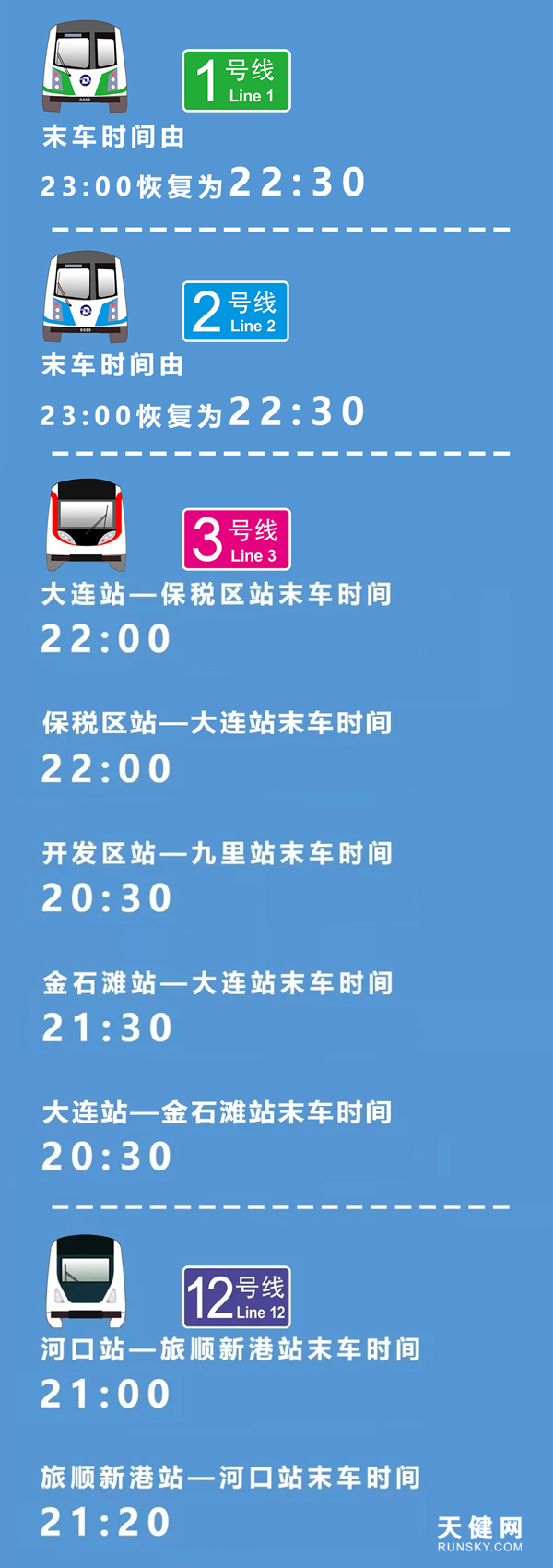地铁1、2号线双向末车由原23:00恢复为22:30;地铁3号线大连站—保税区站双向末车至22:00,开发区站—九里站双向末车至20:30,金石滩站—大连站末车至21:30,大连站—金石滩站末车至20:30;地铁12号线河口站—旅顺新港站末车为21:00,旅顺新港站—河口站末车为21:20。