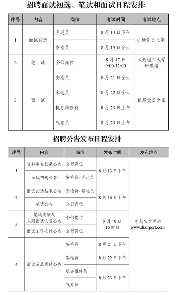 (2)招聘过程中各环节的公告发布平台为大连国际机场官方网站,请及时关注各环节发布的公告信息,机场不再电话、短信通知,出现因个人原因未及时关注公告发布而导致无法参加下一环节的情况后果自负。各环节日程安排见附件,请及时查询,合理安排个人行程。