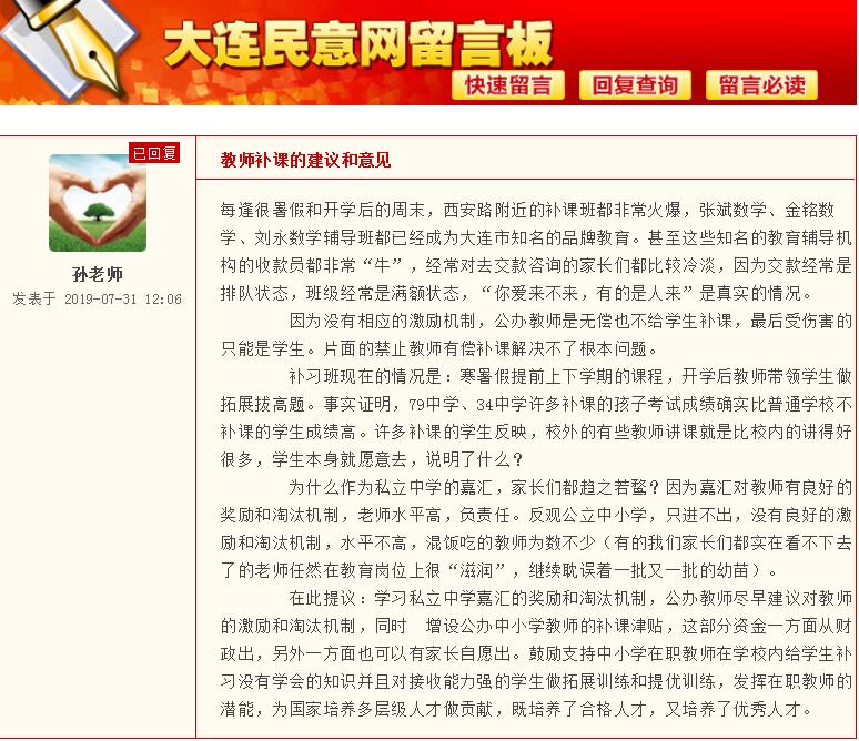 对于在职教师有偿补课现象屡禁不止,市民孙老师建议称:“应学习私立中学嘉汇的奖励和淘汰机制,公办教师尽早建议对教师的激励和淘汰机制,同时,增设公办中小学教师的补课津贴,这部分资金一方面从财政出,另外一方面也可以有家长自愿出。鼓励支持中小学在职教师在学校内给学生补习没有学会的知识,并且对接收能力强的学生做拓展训练和提优训练,发挥在职教师的潜能,为国家培养多层级人才做贡献,既培养了合格人才,又培养了优秀人才。”