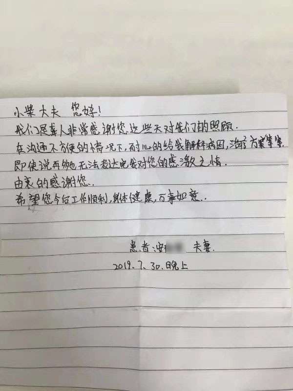 7月30日,小安出院了,出院前小安塞给柴丽娅医生一张小纸条,上面写着:“柴大夫,您好!我们是聋哑人,非常感谢您这些天对我们的照顾。在沟通不方便的情况下,耐心的给我解释病因,治疗方案等等。并给了我很多鼓励。即使说再多也无法表达完我对您的感激之情。由衷的感谢您!希望您今后工作顺利,身体健康,万事如意”。