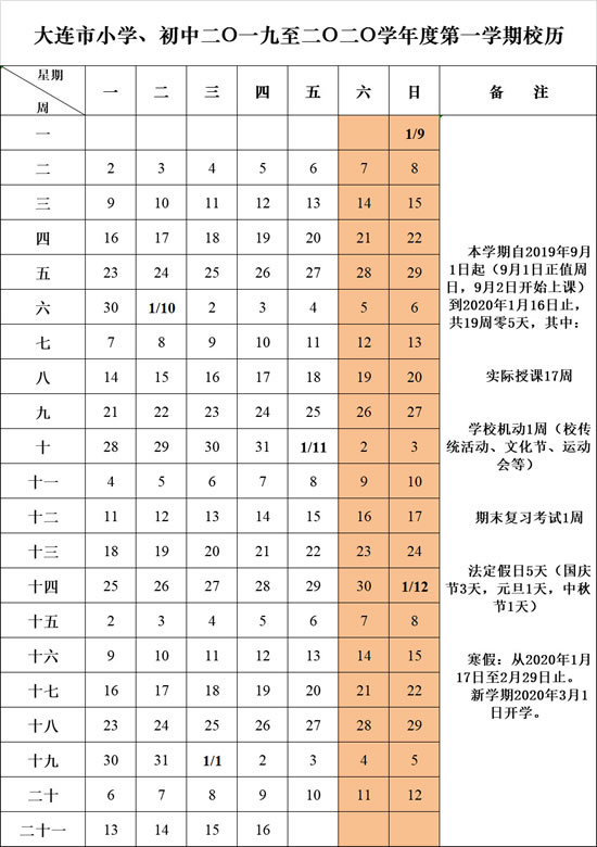 大连市小学、初中二〇一九至二〇二〇年度第一学期校历