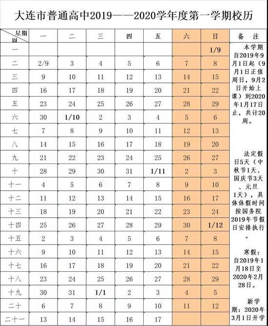 大连市普通高中2019—2020学年度第一学期校历显示:本学期自9月2日开始上课, 寒假自2020年1月18日至2月28日。