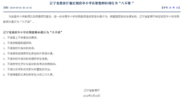 天健网消息(记者 金东淑)为加强中小学教师队伍师德师风建设,进一步治理中小学在职教师违规有偿补课行为,根据国家相关法律法规,近日,辽宁省教育厅制定规范中小学在职教师补课行为“八不准”。