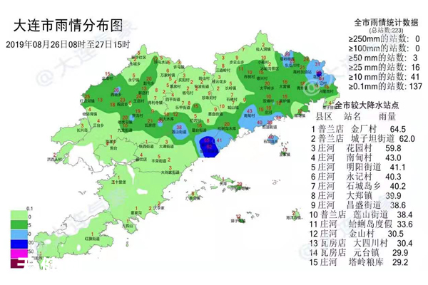 8月26日下午开始,我市陆续出现了阵雨或雷阵雨天气。截至27日15时,瓦房店、普兰店、庄河及长海局部出现中到大雨,其中,普兰店和庄河的个别站点(三个测站)出现暴雨;其它地区小雨。全市平均降雨量为9.5毫米,最大降雨量出现在普兰店金厂村,为64.5毫米,最大小时雨量出现在普兰店城子坦街道,为59.3毫米。