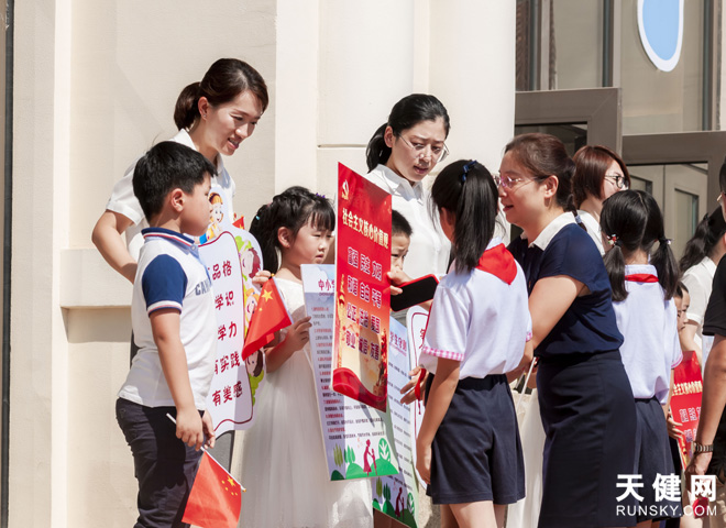 活动中,五郡社区党建联合体的领导们为一年级各班级送上了“班级文化宣传板”,现场全校学生齐声背诵《社会主义核心价值观》、《小学生守则》、《大连市垃圾分类方法》,孩子们再次回顾了这些熟知的内容,场面活而不乱,整齐有序。
