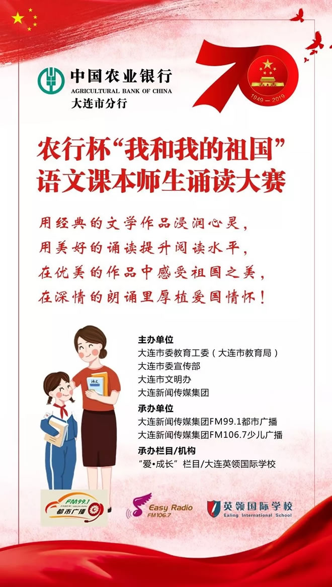 为庆祝中华人民共和国成立70周年,大力弘扬爱国主义精神, 根据中央和省委、市委关于隆重庆祝中华人民共和国成立70周年,广泛组织开展“我和我的祖国”群众性主题宣传活动的知识要求,决定在全市中小学校举办农行杯“我和我的祖国” 语文课本师生诵读大赛。