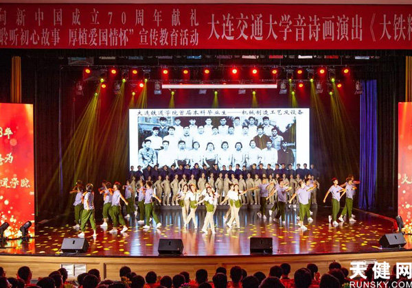 天健网消息(记者 葛春家)9月25日,大连交通大学原创音诗画《大铁精神》在旅顺口校区礼堂倾情上演,向新中国成立70周年献礼。全体校领导、全校副处级以上干部、各党支部书记和全体2019级同学一起在音诗画中回顾学校与中国铁路事业同呼吸、共命运,与新中国的交通和工业共同发展、同向同行的办学历史,重温一代代交大人继承爱国爱校的光荣传统,艰苦创业,自强不息的奋斗历程,聆听初心故事,厚植爱国情怀。