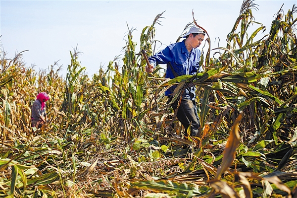花园口经济区钟屯村的村民在自家田里收割玉米。记者王韬飞 摄