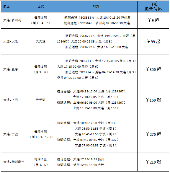 图片为换季后大连航线详细信息