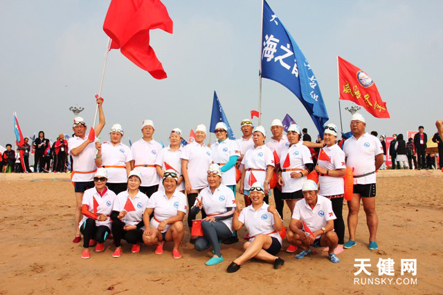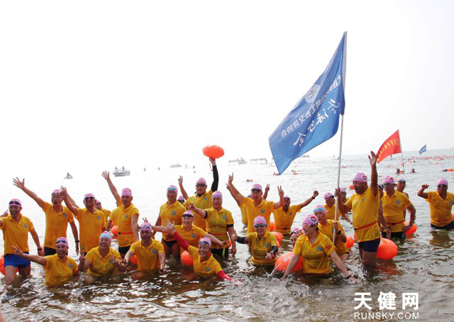 冬泳爱好者排着整齐的队伍朝着大海出发