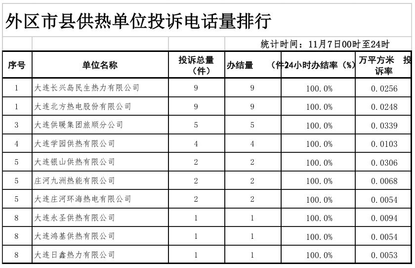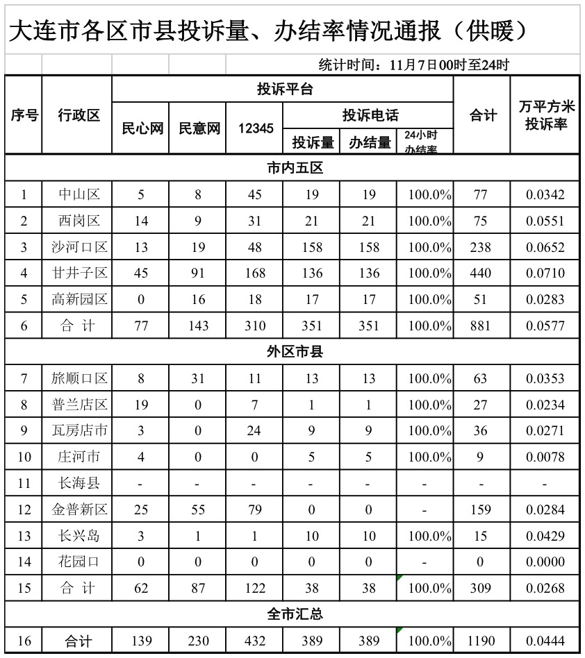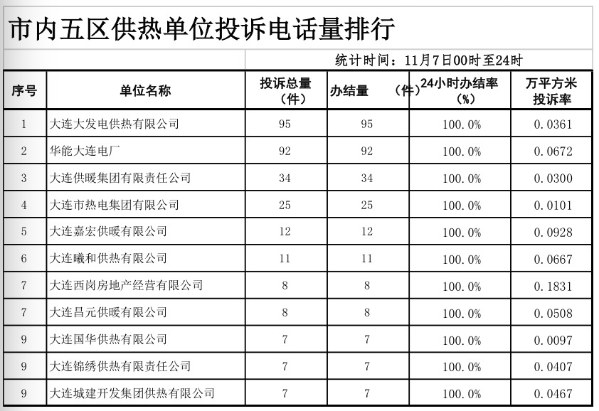 天健网消息(记者 丁一)11月8日,市住建局公布11月7日0时至24时市内五区及外区市县来自民心网、民意网、12345、投诉电话等渠道的供暖投诉量、办结率相关数据,数据显示,该时段全市共接到投诉1190件,甘井子区投诉总量最多,达440件。另外,市内五区供热单位投诉电话量排行中,大连大发电供热有限公司受到投诉95件,是市内五区被投诉最多的供暖企业。在外区市县供热单位投诉电话量排行中,大连长兴岛民生热力有限公司受到9件投诉,是外区市县供热单位被投诉第一的供暖企业。