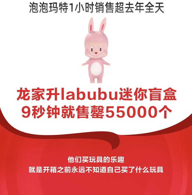 天猫官方数据显示,1小时03分59秒,天猫双十一成交总额冲破1000亿大关,创下了新纪录。天猫泡泡玛特旗舰店1小时销售额超去年全天,其中龙家升labubu迷你系列盲盒9秒钟就售罄55000个。以95后为主力消费群体的盲盒市场,在天猫双十一迎来了自己的高光时刻。