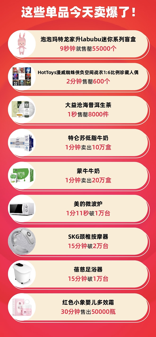记者注意到,在天猫上零点就“秒空”的商品,已经超出了人们的想象。二次元、养生等成为了爆款的关键词。HotToys漫威蜘蛛侠负空间战衣1:6比例珍藏人偶2分钟售罄;大益沧海普洱生茶1秒售罄8000件;特仑苏低脂牛奶1分钟卖出10万盒;蒙牛牛奶1分钟卖出20万盒;美的微波炉1分11秒销售突破1万台;SKG颈椎按摩器15分钟销售突破2万台;蓓慈足浴器15分钟销售突破1万台;红色小象婴儿多效霜30分钟售出50000瓶······95后、50后和小镇青年是淘宝过去两年2亿新用户中最主要的人群,也是今年天猫双十一深度参与的用户。