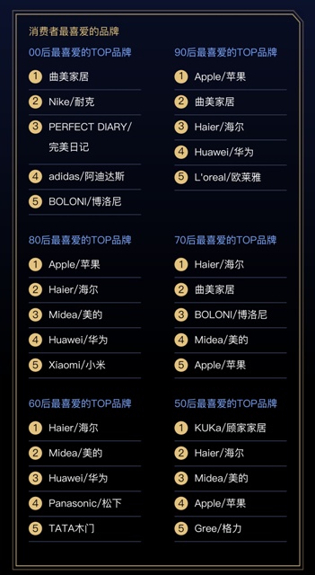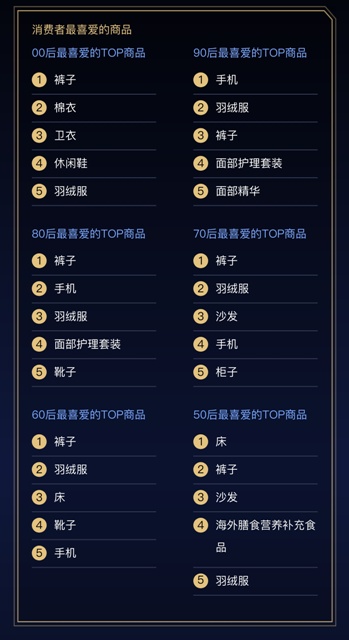 在“双11”消费群体中,大连90后成为主力军,占比34.6%。紧随其后的是80后,占比34.1%。50后消费占比仅有1.9%。大连人最爱买什么?数据显示,各年龄段“萝卜、白菜各有所爱”。按年龄群体分,裤子、棉衣、卫衣、休闲裤和羽绒服成为00后最喜爱的TOP商品,90后则偏爱手机、羽绒服、裤子、面部护理套装和面部精华。相比年轻人,50后的最喜爱的商品则是“家居”和“养生”。床、沙发、营养品都登上TOP榜单。