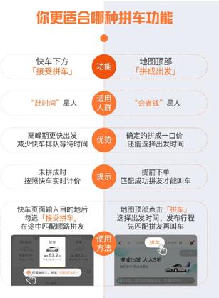 滴滴拼车是在快车基础上的衍生产品,由快车司机和车辆提供服务,系统将路线相近的乘客进行匹配,共享车上的每一个座位,从而分担车费、降低出行成本。拼车能够有效减少车辆空驶率,提高交通效率,让有限的网约车供给和城市道路资源得到最大化利用。