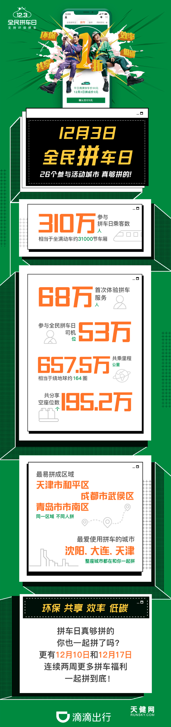 天健网消息(记者 王煜)“12月3日你拼车了吗?”这句话成为小伙伴们互相打招呼的问候语。12月3日,滴滴“全民拼车日”掀起实惠、绿色的网约车拼车热潮,滴滴公布数据显示,12月3日在26个活动城市共有310万名乘客参与,其中有68万乘客是首次体验拼车,活动累计分享195.2万个快车空闲座位,为高效环保的城市交通做出贡献。咱大连成为在此次全民拼车日里最爱使用拼车的三个活动城市之一。