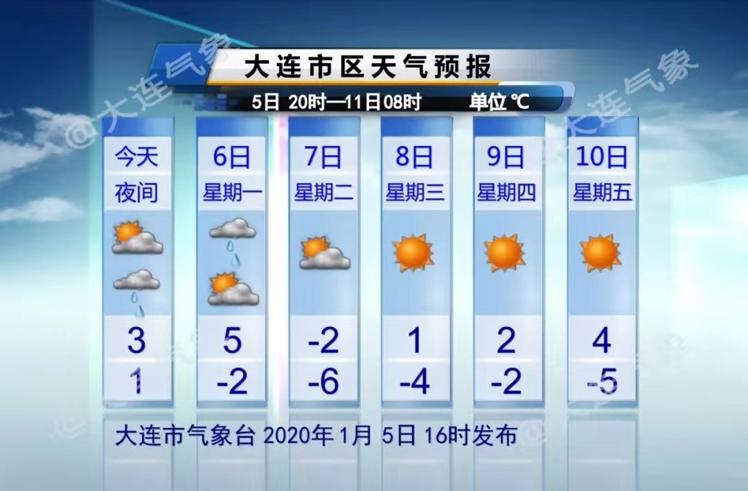受西风槽及槽后冷空气影响,1月6~8日我市将出现雨雪和大风降温天气。今天半夜到明天白天,我市南部地区和长海有小雨或小雨夹雪,北部地区有小雨夹雪或小雪,别看明天白天最高气温暂时还在3~5℃,但明天半夜随着冷空气到来,周二寒冷就会紧随而至了。预计周二市区全天气温只有-6~-2℃,陆地北风可达6~7级,部分地区还会继续飘雪,要等到周三天气才会好转,全天气温小幅回升至-4~1℃。周四这股冷空气会彻底离去,届时“三九”开局市区白天又将重返2~4℃的水平。