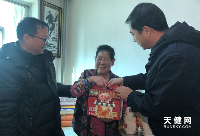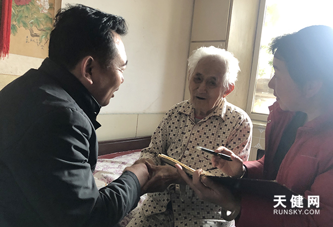 今年103岁的刘兰亭老人住在沙能街136号3单元302室,除了耳背之外,百岁老人身体健康硬朗。“要是感觉家里不暖和,就让子女联系我们,保证第一时间上门为您解决问题!在这里也祝您新年快乐,健康长寿。”看到老人起身相迎,工作人员带着慰问品快步上前,为老人送上新春祝福。