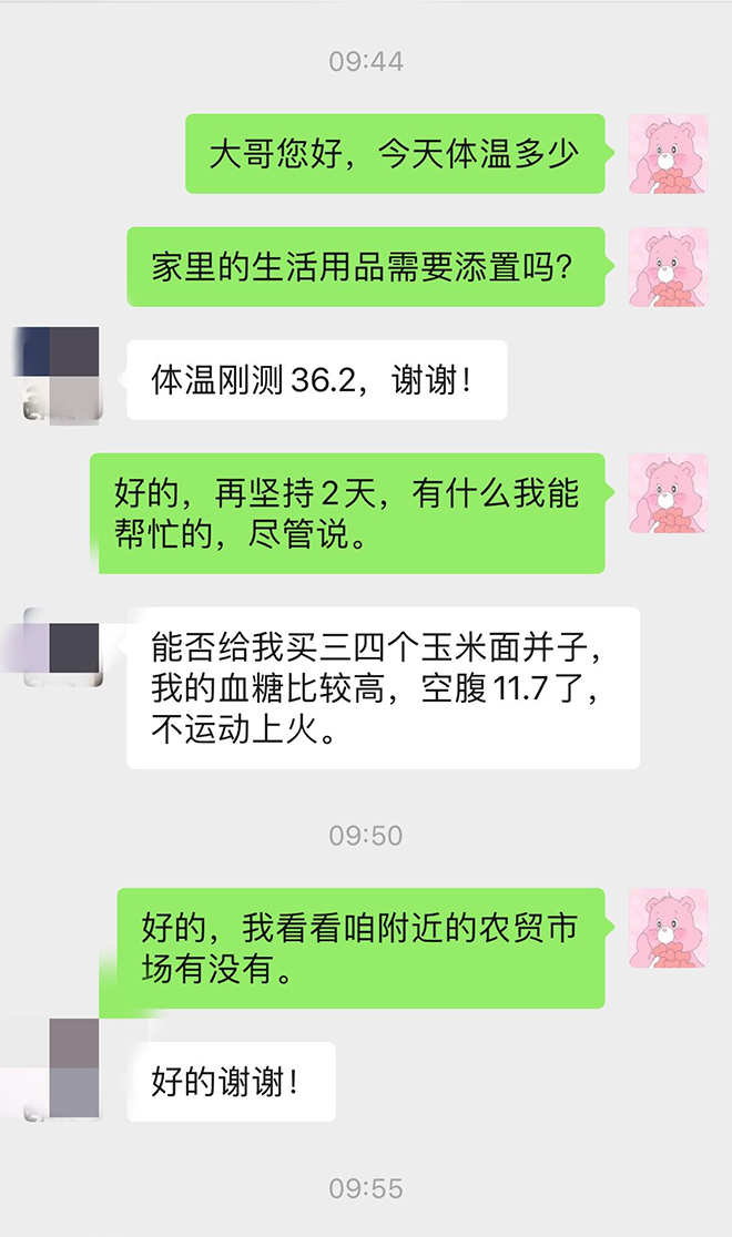 对于排查出的密切接触人员,为了保护社区其他工作人员的安全,王晶总会亲自上阵,每天与他们联系,随时掌控情况,上门送去消毒、防护用品以及生活用品,同时叮嘱其要在家做好隔离。一位密切接触人员患有糖尿病,由于隔离不能锻炼身体,血糖控制的不太好,需要吃玉米面饼子控制血糖。王晶就辗转几个地方为他购买。“谢谢你王书记,你的所作所为感动着我,我一定积极配合社区做好居家观察,我们一起加油打赢这场“疫”情攻坚战。”该名密切接触者激动的说。