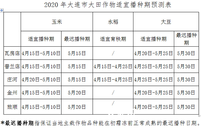结合地温、墒情及未来天气趋势预测综合分析,大连市气象服务中心发布大田作物适播期预报。预计今年我市大田玉米适宜播种期4月15日至5月10日,大豆适宜播种期4月20日至5月25日,水稻适宜育秧期4月15日至4月25日。