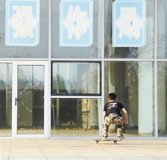 在蛇博物馆门前,一个小孩正在专心致志地练着滑板。(摄影:张广才)