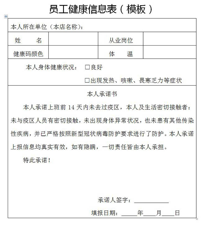 1.公示职工健康证明。包括职工姓名、性别、年龄和照片,职工复工前14天的健康状况等内容。体温正常且健康码和行程卡呈绿色,窗口服务工作人员核酸检测结果呈阴性,方可上岗。关注重点地区来连人员,重点地区来连职工按相关规定执行。