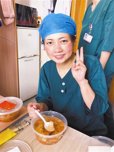 16时多,大连市皮肤病医院护士刘玉梅在刘长春小学检测点采样工作结束了,她已经热得浑身湿透,脱下防护服,拿起银耳羹喝上一大口,直呼“舒服!”大连市中心医院护士刘巍在检测点忙完后,想起银耳羹,捧起一碗说:“还有梨呀!”满脸压痕的她笑得很开心。