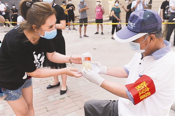 11时30分,50多碗银耳羹被送到位于春柳小学的采样点。“谢谢!谢谢!”在这儿忙碌的社区工作者于雷哑着嗓子努力表达着。这个点设立第一天,他的嗓子就喊哑了。银耳羹的到来,让他和“战友们”很高兴。“这可是最火的‘网红食品’,咱们也吃上了!”志愿者们捧起碗,看了又看,舍不得一口吃完。