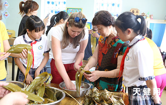 活动开始前,香二小学的学生代表为同学们和外国留学生们讲解端午节的起源。在包粽子比赛之前,先由最美家庭的几位奶奶传授大家包粽子的方法。随后,活动通过包粽子和画彩蛋两个小游戏,让外国留学生以及小朋友们充分融入到节日的氛围中。一时间, 空气中弥漫着芦苇叶和糯米的清香。