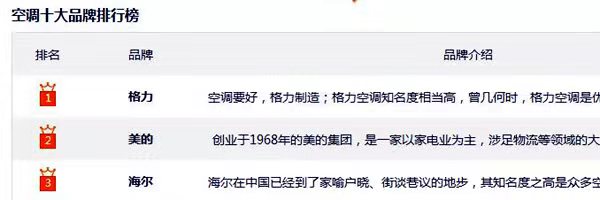目前国内比较畅销的空调品牌有格力、海尔、美的、海信、大金、志高、松下、科龙、奥克斯、三菱、长虹、格兰仕等,记者查阅多家产品排行榜权威网站发现,在全年销量和总体的用户口碑方面,格力、海尔、美的三个品牌基本占据前三位。