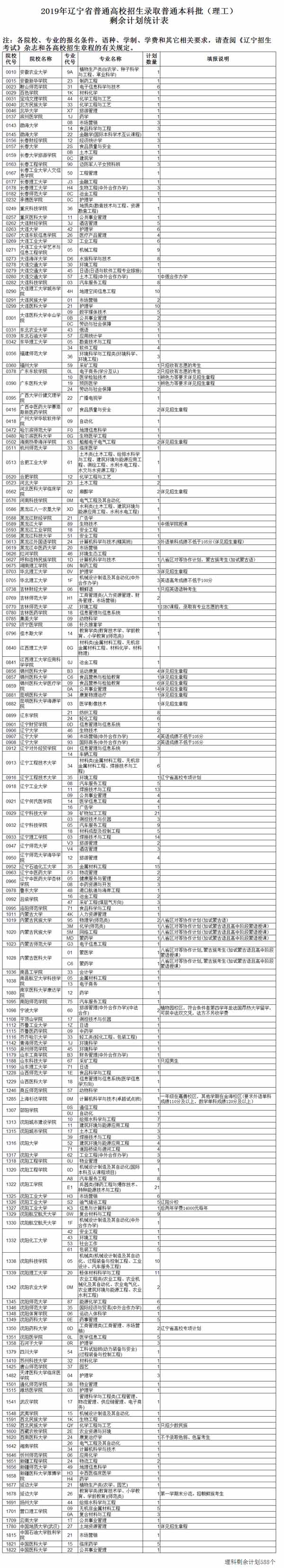 2019年辽宁省普通高校招生录取普通本科批(理工)剩余计划统计表