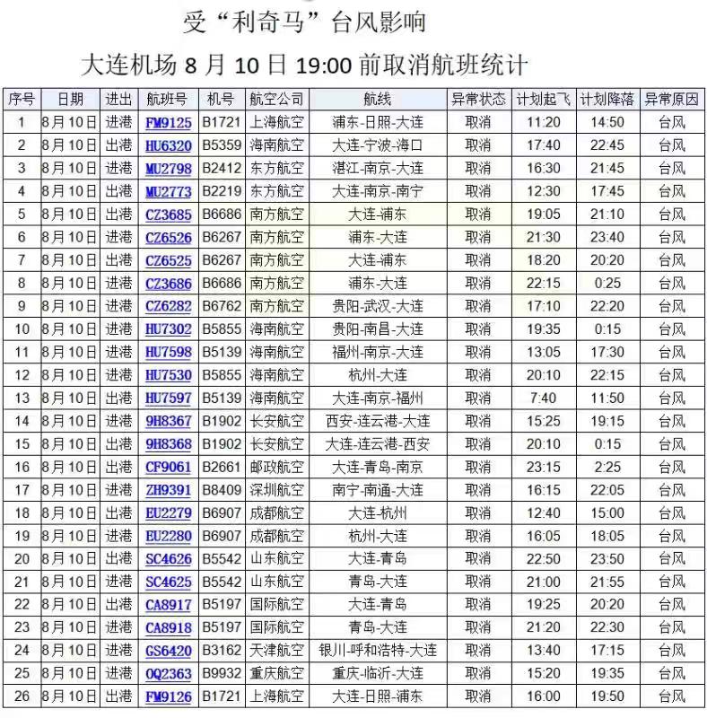 截止8月10日19时 大连国际机场有26个航班取消