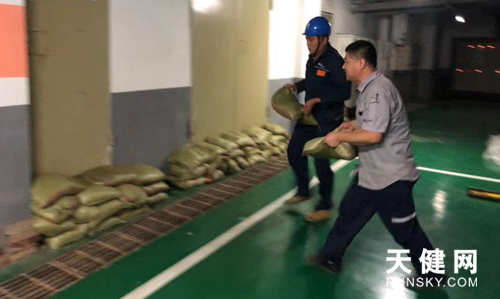 国网大连甘井子供电分公司配电一班张奇与物业公司一起对金地艺境2号配电站布置防汛沙袋封堵水害