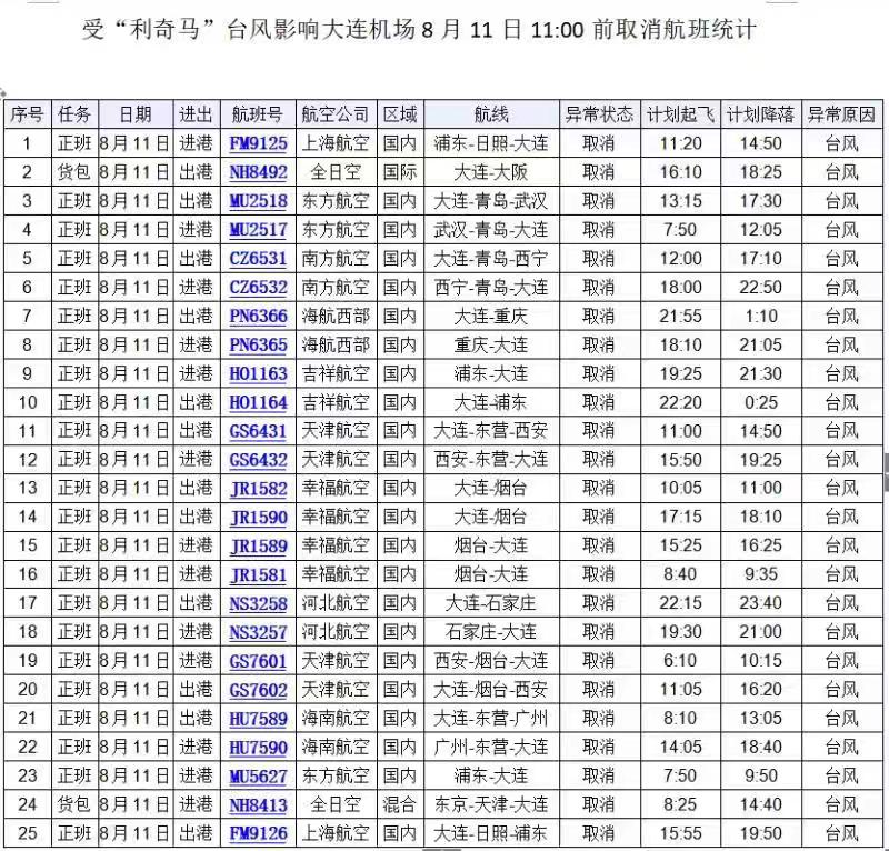 天健网消息(记者 王煜)受台风“利奇马”影响,截止8月11日11时,大连机场25个航班取消。