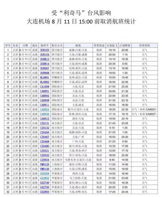 天健网消息(记者 王煜)大连本场及浦东、青岛、烟台等部分机场受9号台风“利奇马”登陆影响,航路雷雨覆盖,流控严重。大连机场共有77个进出港航班取消!