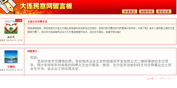 而在民意网上也有网友提到,“很多小城市都可以支付宝或者微信付费乘坐公交”,他建议,大连作为旅游城市应该尽快实行公交车移动支付功能。