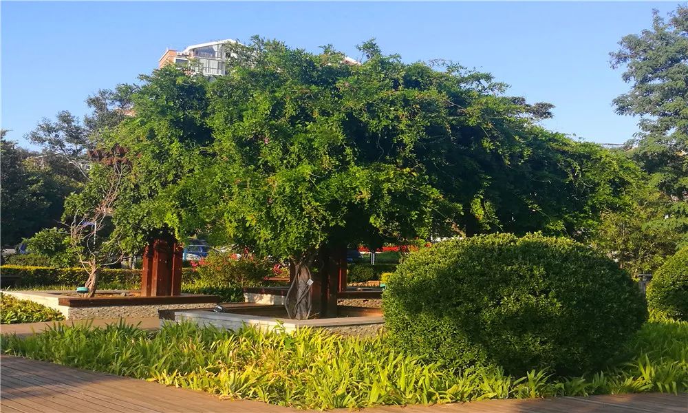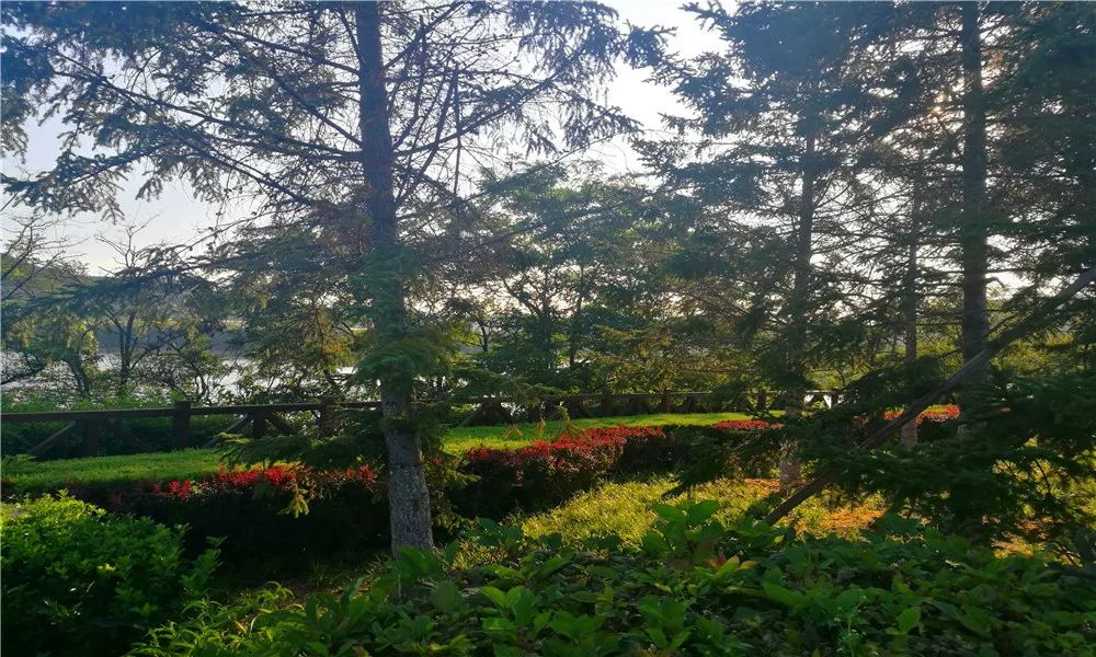 树木、小草、花卉形成了错落的景致。