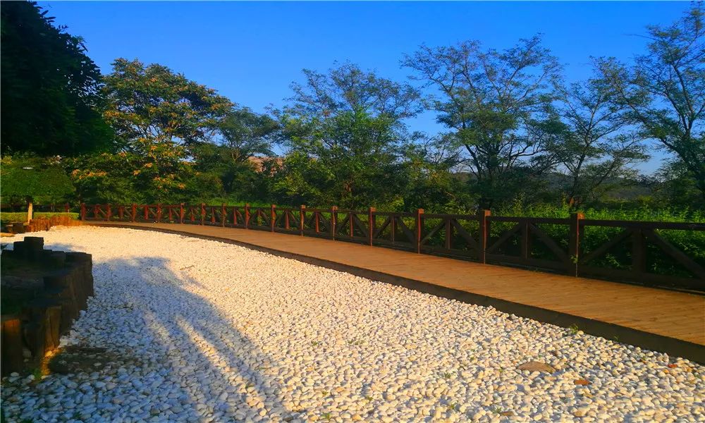 木栈道被绿树、绿草映衬。