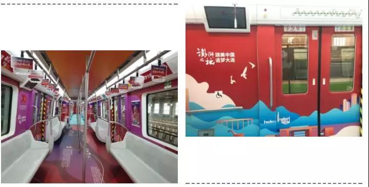 车厢内,将国徽、天安门、五星红旗及具有大连特色的手绘图案纷纷融入到设计当中,展现了国家的发展和大连的城市变化。车厢以红色和蓝色为主基调,车门边还贴有会议中心、海事大学、跨海大桥等大连标志性建筑手绘元素。