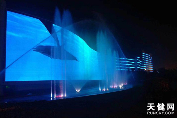 在曲面屏北侧建成“S”形音乐喷泉一座,喷泉长70米,宽9米,表演内容与显示屏播放画面联动。喷泉控制系统内设计新型的一维数控技术,变换的水形如蝴蝶飞舞,配合大屏幕和音乐此起彼伏,美不胜收。
