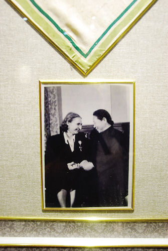 在200多件展品中,一块镶在镜框中印有“中苏友好”徽标和字样的手帕引起了记者的注意。这块白色的方巾经过岁月的洗礼已经略显斑驳,上面有多处细小虫蛀的痕迹,但是边角完整,手帕很平整。手帕下方,是丛春梅和一位苏联女代表的合影。这件展品说明中提到,这是上世纪五十年代初“旅顺市军属互助工厂厂长丛春梅大娘遗留下来的”,留给了当年的一位小伙子——如今已67岁的大连老人,旅顺市收藏协会会长徐世涛,而徐世涛是这块手帕的第三任主人。
