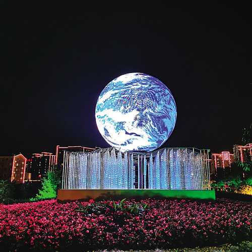 以海浪造型“辅佐”的全彩球屏幕,可将多种光影效果呈现给市民游客。(高强 摄)