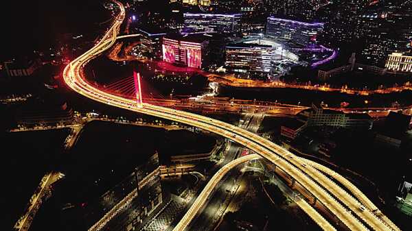 夜景灯光让大连市区道路变身条条长龙,与建筑物上的“中国红”交相辉映。(高强 摄)