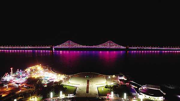 星海湾大桥上霓虹绚烂、华灯璀璨,将整个海湾渲染得如梦似幻。(高强 摄)